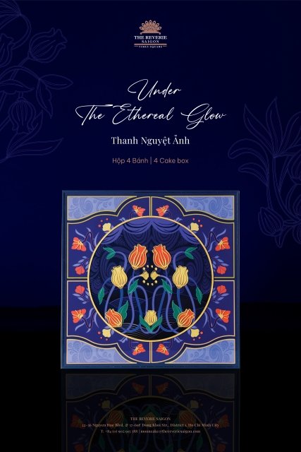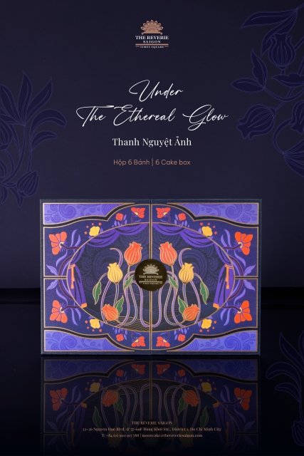 Bên cạnh đó, thiết kế hộp 8 bánh được tiếp cận một cách đặc biệt hơn khi dùng chính hình ảnh tường hoa mosaic đặc trưng tại The Reverie Saigon. Những đóa hoa rực rỡ, khoác lên mình lớp áo dạ nguyệt lấp lánh và kiêu sa. Đây cũng là phiên bản đặc biệt nhất mùa trăng rằm năm nay. Theo phong tục ăn bánh thưởng trà của người Việt, hộp bánh với đầy đủ 8 hương vị mang âm hưởng đương đại, đi kèm cùng một gói trà thượng hạng phù hợp cho buổi đại đoàn viên.
