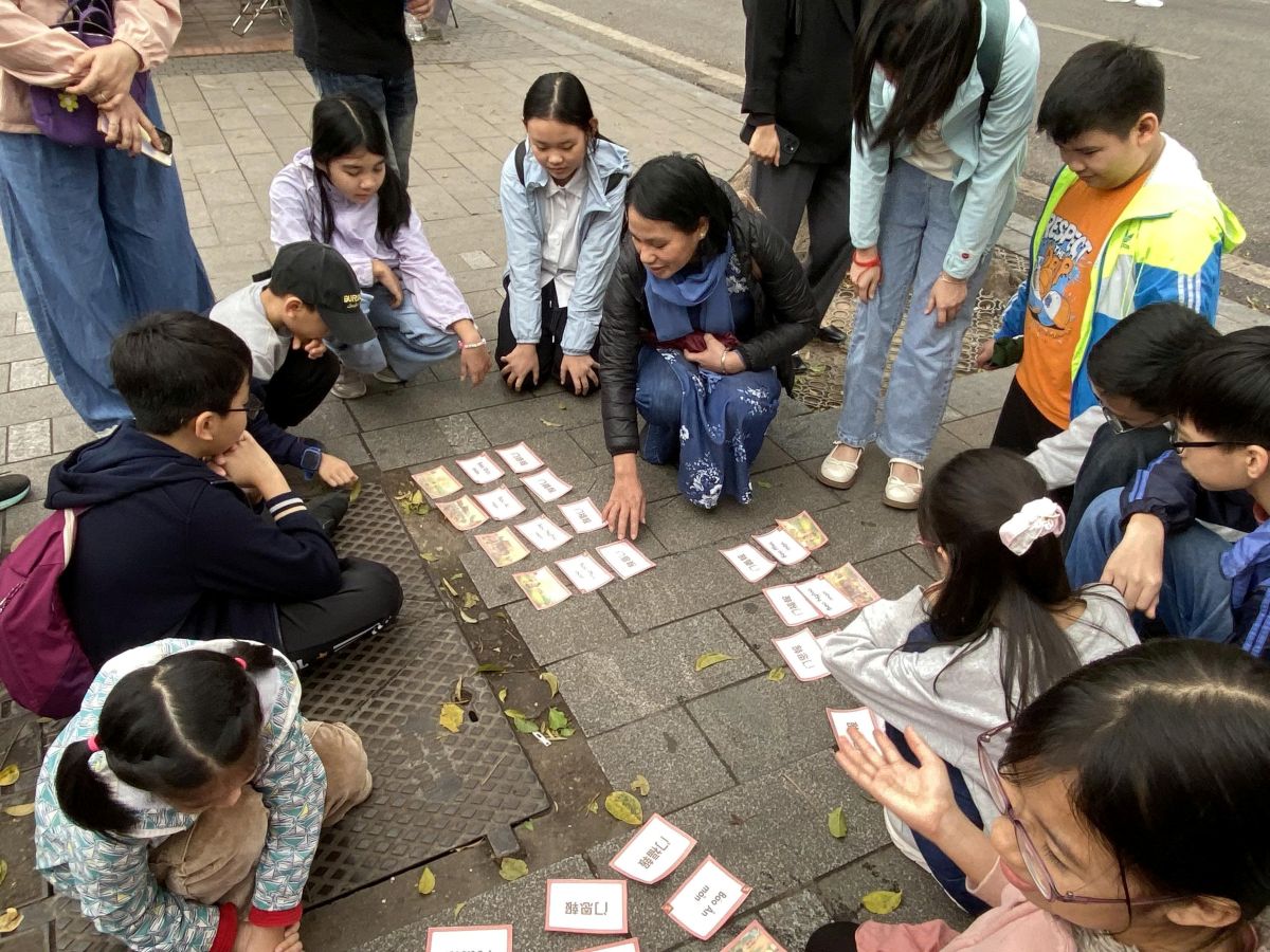 Các em học sinh lắng nghe câu chuyện về lịch sử chữ Quốc ngữ tại Tháp Hoà Phong trong hành trình khám phá di sản đô thị.