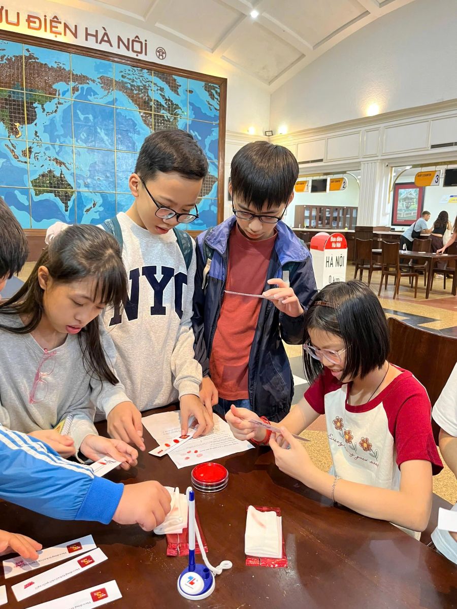Học sinh tham gia hoạt động tương tác và giải mật thư tìm hiểu về hành trình hình thành chữ Quốc ngữ tại Bưu điện Hà Nội.