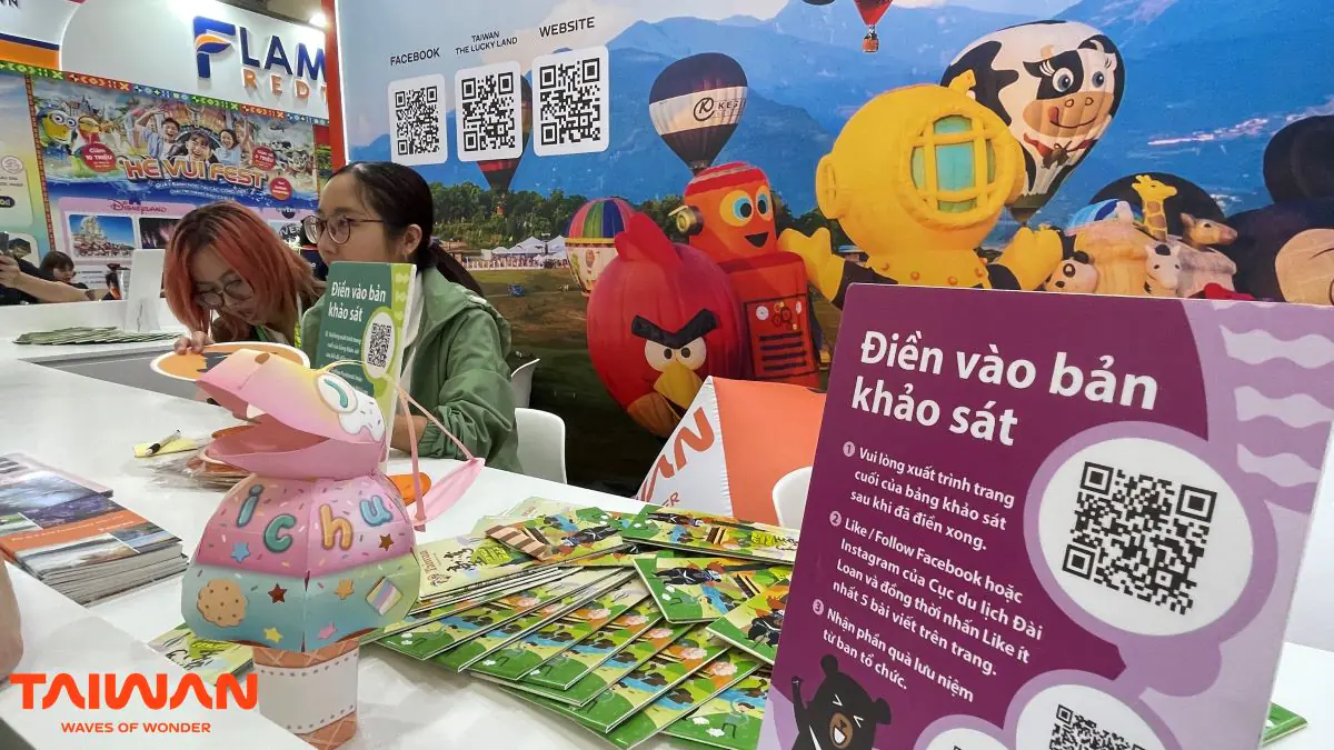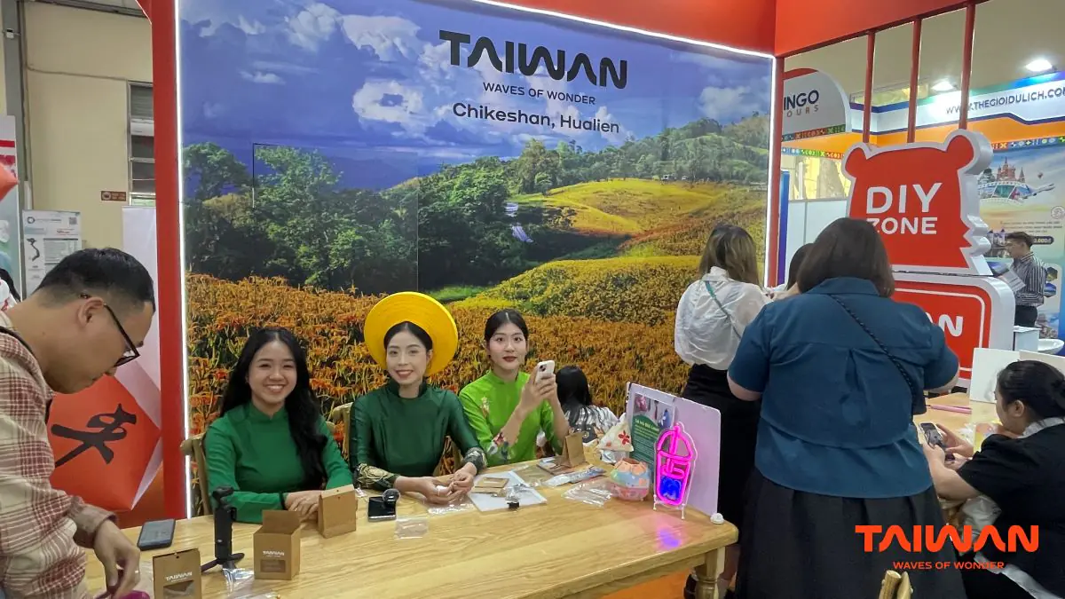 Gian hàng Đài Loan quy tụ 29 công ty lữ hành, 3 hãng hàng không (EVA Air, China Airlines và STARLUX Airlines), cùng đoàn nghệ thuật biểu diễn gồm 50 thành viên tạo nên một không gian sôi động, đầy sắc màu. Các hoạt động nổi bật bao gồm trải nghiệm làm túi thơm thủ công và thưởng thức đậu hũ mềm (Toufu) – món tráng miệng đặc trưng của Đài Loan, giúp du khách cảm nhận Đài Loan qua cả vị giác và khứu giác. Bên cạnh đó, những màn trình diễn trẻ trung, sôi nổi cũng mang đến hình ảnh năng động, hiện đại của Đài Loan đến gần hơn với người Việt.